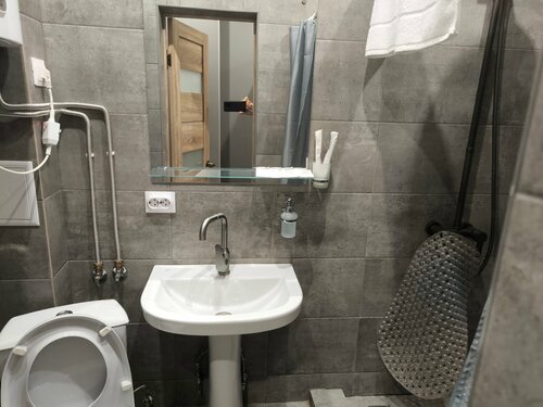 В ванной: 3 полотенца, фен, водонагреватель, душевая, средства для гигиены. Здесь не хватало освежителя воздуха!